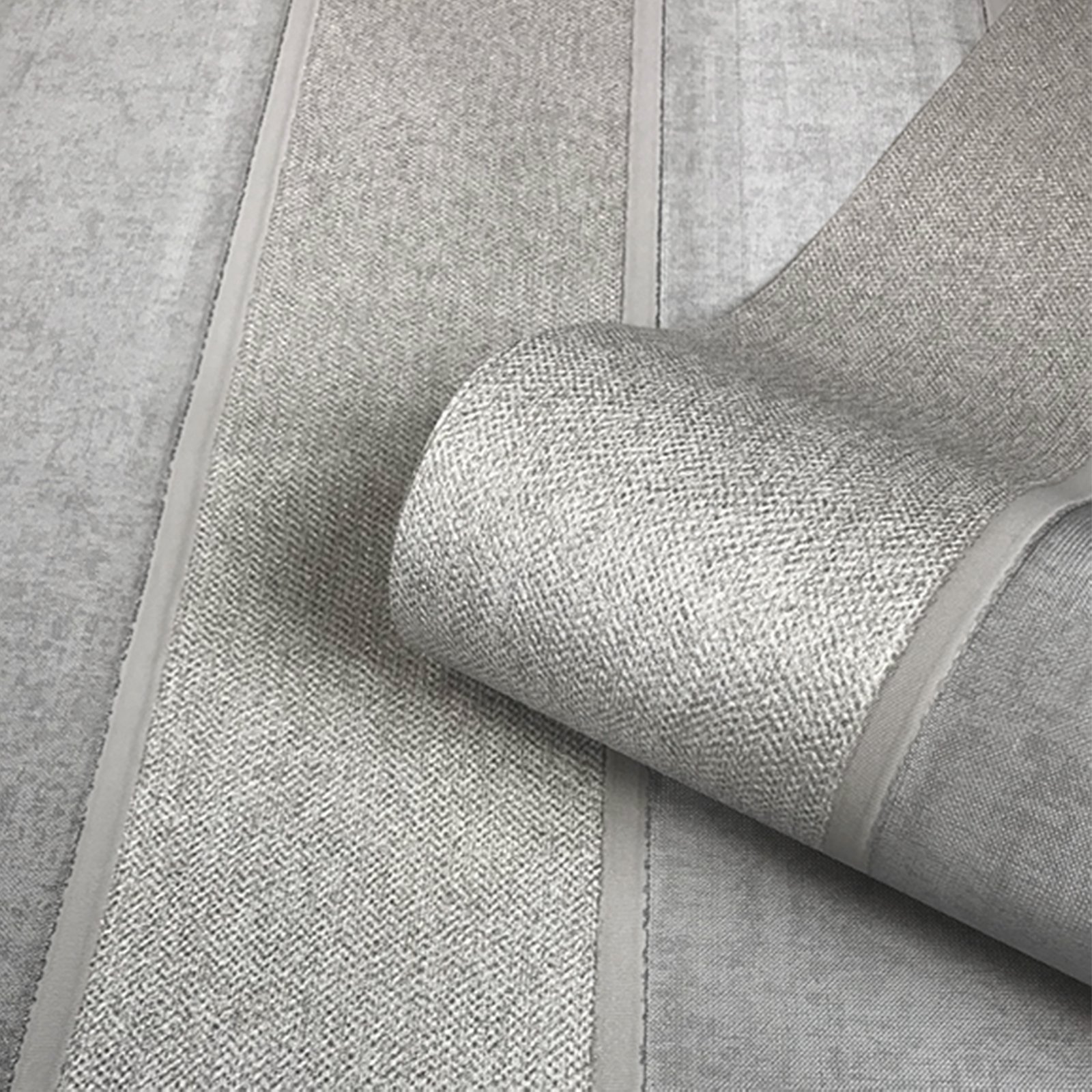 Heavy weight luxury vinyl wallpaper from Belgraiva Decor's Aurora Collection by Zambaiti Parati. Bold solid grey & deep textured hessian stripe in rich stone tones.